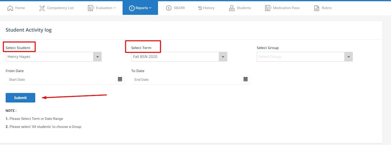 5. Select the TERM from the drop-down list or choose the Start and End date instead for multiple terms.