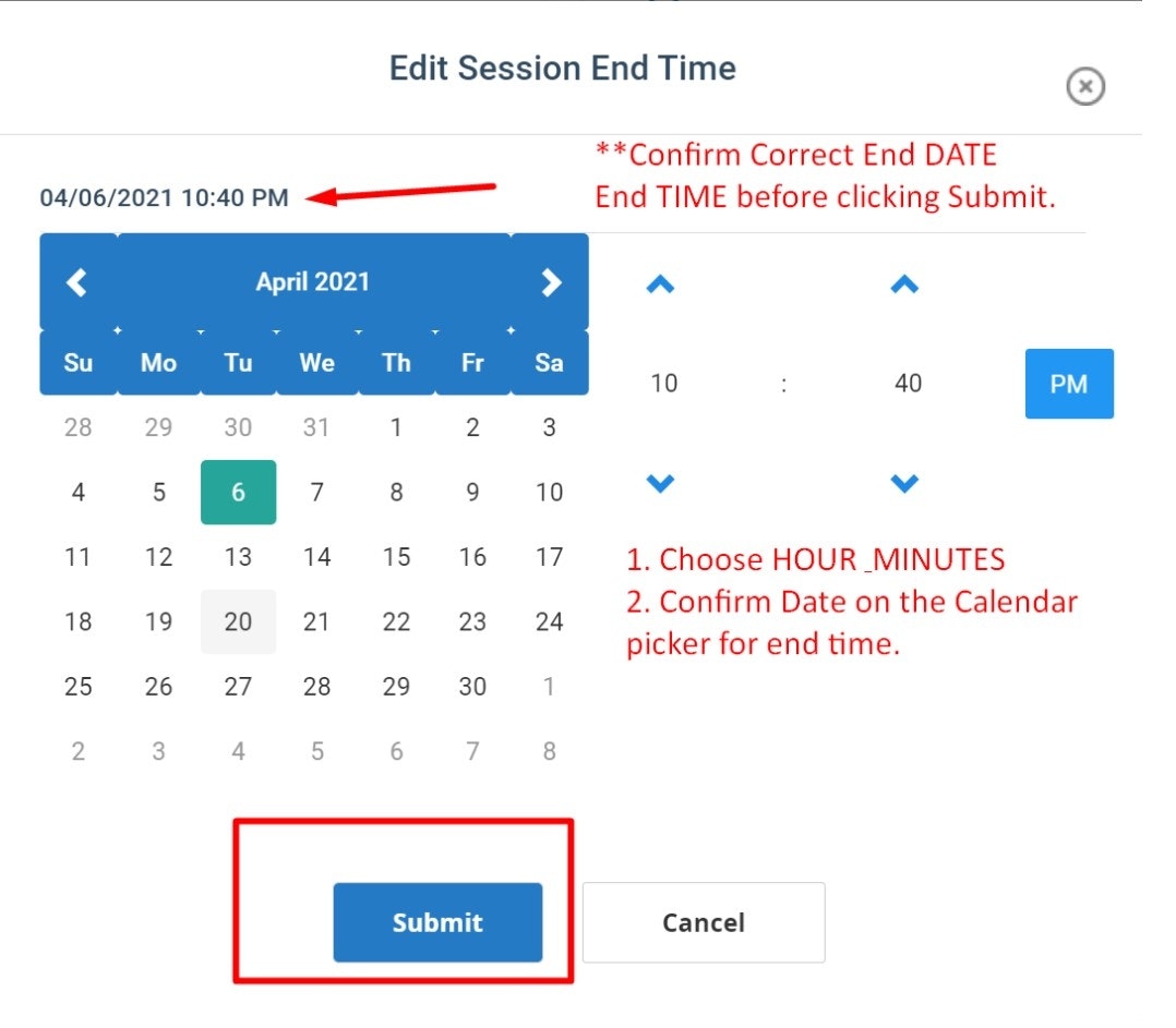 8. Confirm the end time matches the desired End Date/Time (shown above Calendar).
