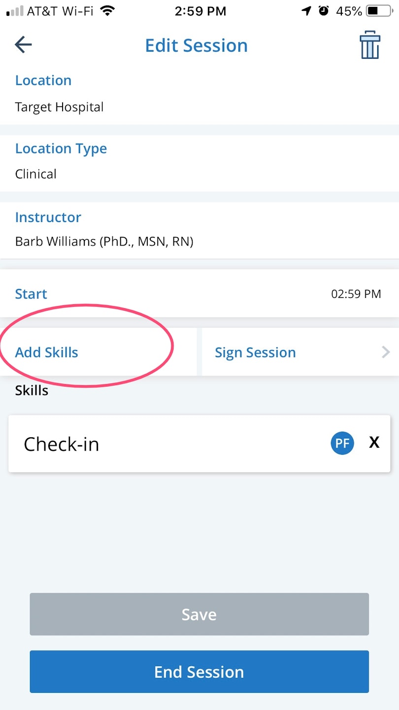 10. Select SAVE and END SESSION when all skills have been added and you are ready to submit task(s)/time to your instructor. (Note: NO changes can be made once you End Session)