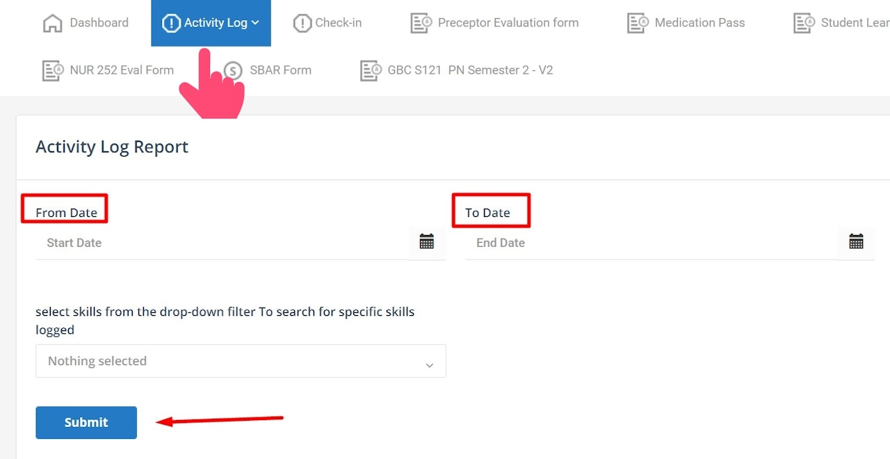 2. Click ACTIVITY LOG and select REPORTS on your student dashboard